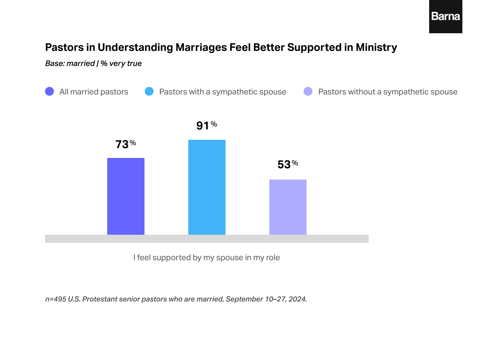 When pastors feel their spouse understands their struggles, they are nearly 40-percentage points more likely to say it’s very true that they feel supported by their spouse in their role. Deep understanding from a spouse makes a lasting difference that extends beyond the marriage to a pastor’s vocational well-being.